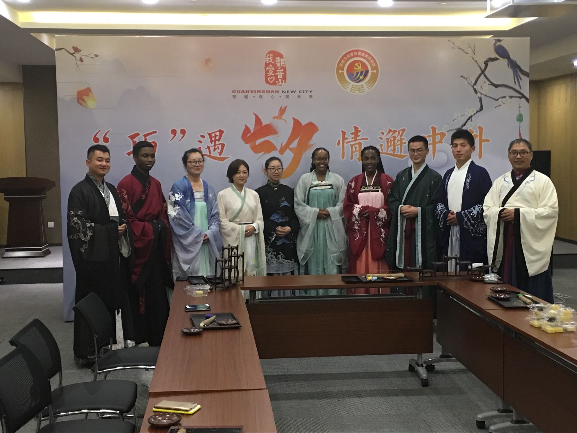 這次活動(dòng)吸引了觀音山新城、國城廣場、國城璟府等社區(qū)及相關(guān)外籍來賓前來參加。本次活動(dòng)圍繞七夕的由來、漢服的由來及穿戴、中國功夫茶、鵲橋搭建、中國糕點(diǎn)文化及糕點(diǎn)品鑒等展開,內(nèi)容豐富多彩,場面和諧熱烈。