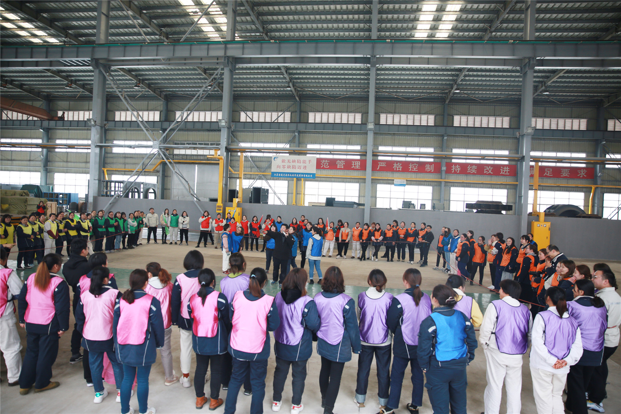 3月8日下午, 一百多名女職工歡聚2號(hào)車間,在教練的帶領(lǐng)下,分成了10個(gè)小組,按照要求分別設(shè)計(jì)了自己隊(duì)的隊(duì)名、隊(duì)徽、口號(hào)、隊(duì)歌,并依次展示了團(tuán)隊(duì)風(fēng)采。在充滿樂趣的熱身小游戲后,便開始了“坦克大戰(zhàn)”、“環(huán)游世界球”、“動(dòng)力繩圈”等團(tuán)隊(duì)拓展項(xiàng)目。在彼此信任、相互溝通、集體協(xié)作的氛圍中,各小組成功完成了此次拓展任務(wù)。參加此次活動(dòng)的廣大女職工們有長期伏案的科員,有奮戰(zhàn)一線的工人,也有集團(tuán)中高層領(lǐng)導(dǎo),在新組建的團(tuán)隊(duì)中,大家拋開身份,融入隊(duì)伍,在隊(duì)長的帶領(lǐng)下,克服困難,團(tuán)結(jié)一心,共同為隊(duì)伍加分增光。 此次拓展活動(dòng),既緩解了女職工們工作的疲憊和壓力,又增進(jìn)了同事間的友誼,增強(qiáng)了團(tuán)隊(duì)凝聚力,大家在娛樂中感受到團(tuán)隊(duì)的力量。集團(tuán)黨委副書記、工會(huì)主席李建兵給女工們送上節(jié)日的祝福,他表示,廣大女職工們?cè)诖舜位顒?dòng)中充分展示了巾幗風(fēng)采,彰顯出金通靈女工隊(duì)伍的魅力,在今后的工作中,大家要時(shí)刻握緊手中的“動(dòng)力繩”,勁往一處使,力往一處用,跟著團(tuán)隊(duì)的步調(diào),以奮發(fā)昂揚(yáng)的姿態(tài)繼續(xù)前行! |