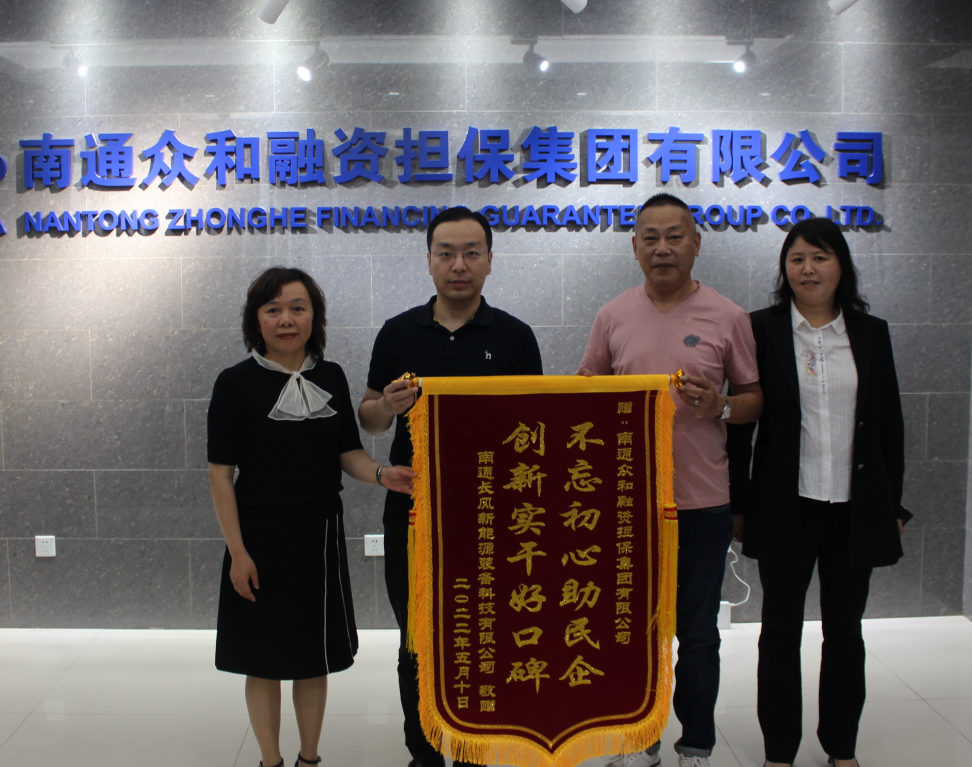 近日,眾和擔(dān)保收到一面來自南通長風(fēng)新能源裝備科技有限公司送來的印有“不忘初心助民企,創(chuàng)新實干好口碑”的答謝錦旗,對我司提供暖心、貼心的擔(dān)?!凹皶r雨”表示誠摯感謝。