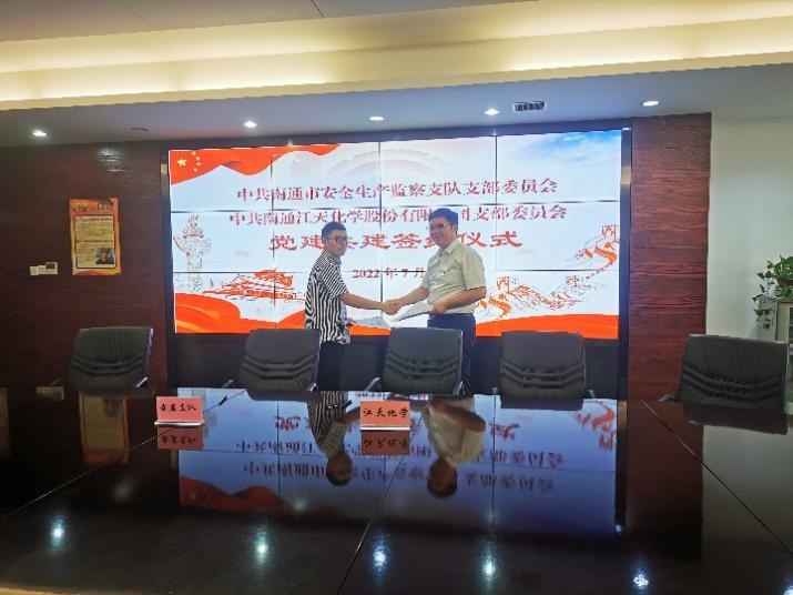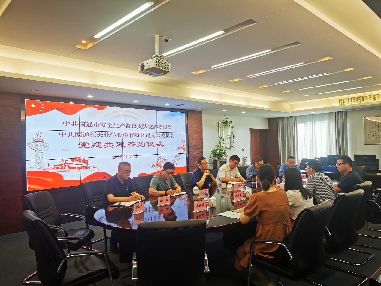 為認(rèn)真貫徹落實(shí)習(xí)近平總書(shū)記關(guān)于安全生產(chǎn)方面的重要論述,深化“紅色引領(lǐng) 綠色智造”黨建品牌建設(shè),深入推進(jìn)融合黨建實(shí)踐,提升安全生產(chǎn)管理工作成效。7月份,江天化學(xué)黨支部與南通市安全生產(chǎn)監(jiān)察支隊(duì)黨支部開(kāi)展了黨建共建簽約儀式,進(jìn)一步加深合作交流,創(chuàng)新黨建結(jié)對(duì)共建形式。
