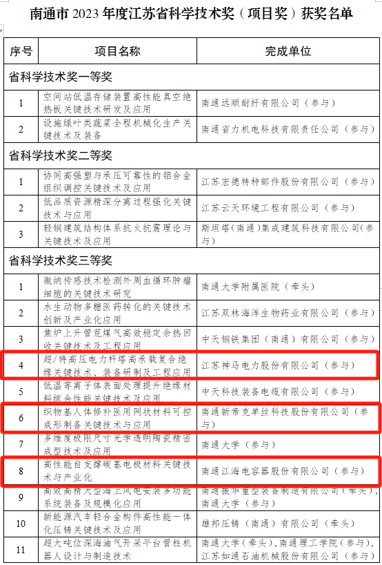 其中,通富微電子股份有限公司榮獲江蘇省企業(yè)技術(shù)創(chuàng)新獎江蘇神馬電力股份有限公司、南通新帝克單絲科技股份有限公司、南通江海電容器股份有限公司各自參與的項(xiàng)目榮獲江蘇省科學(xué)技術(shù)獎(項(xiàng)目獎)三等獎。